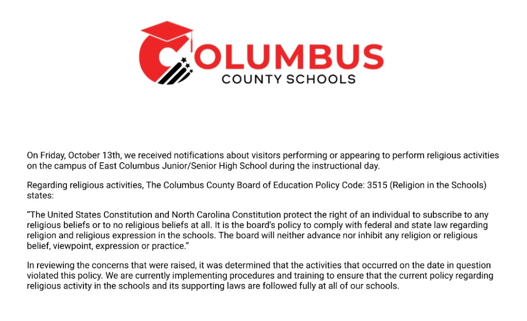 “On Friday, October 13th, we received notifications about visitors performing or appearing to perform religious activities on the campus of East Columbus Junior/Senior High School during the instructional day.