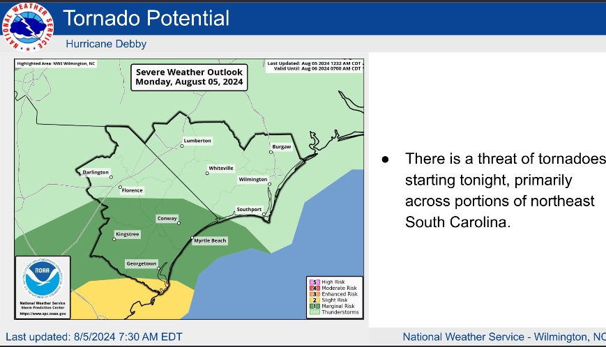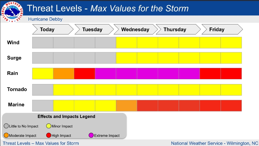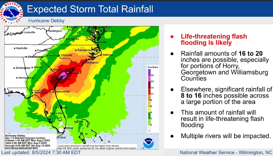 Ahead of Debby, expected to hit North Carolina as a Tropical Storm, the National Weather Service has called for a potential of extreme flooding from rain associated with the storm. Below is the local National Weather Service’s weather briefing: