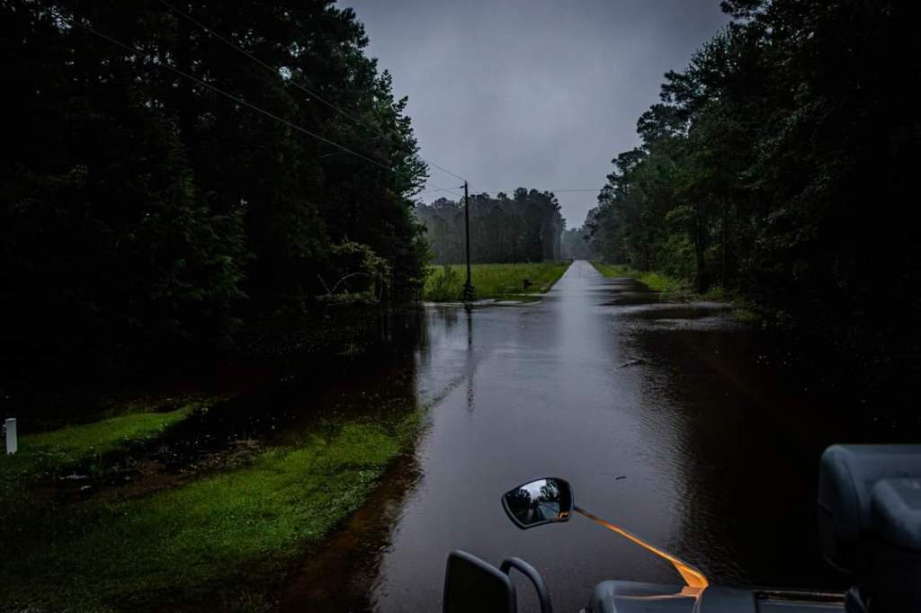 Fertilizer Rd x Neils Eddy Rd, Riegelwood (high water, black Kia Optima stuck in high water; vehicle remains)