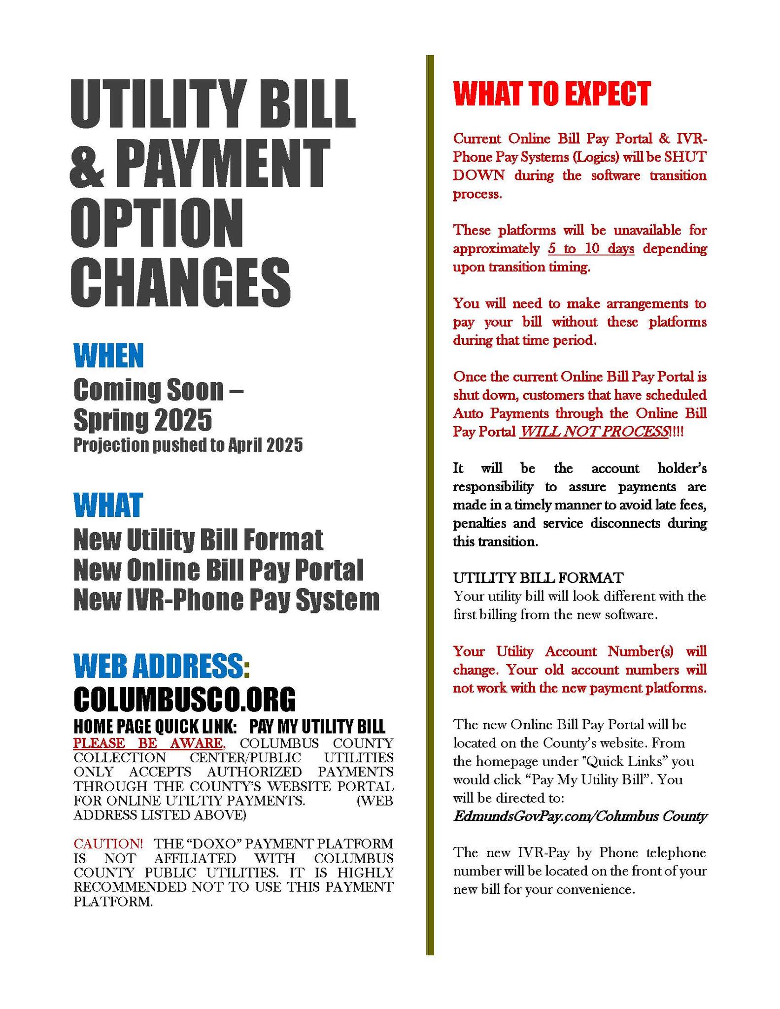 Columbus County residents should be aware of upcoming changes to their utility billing and payment systems. These changes are part of a software transition that is expected to take place in April 2025.