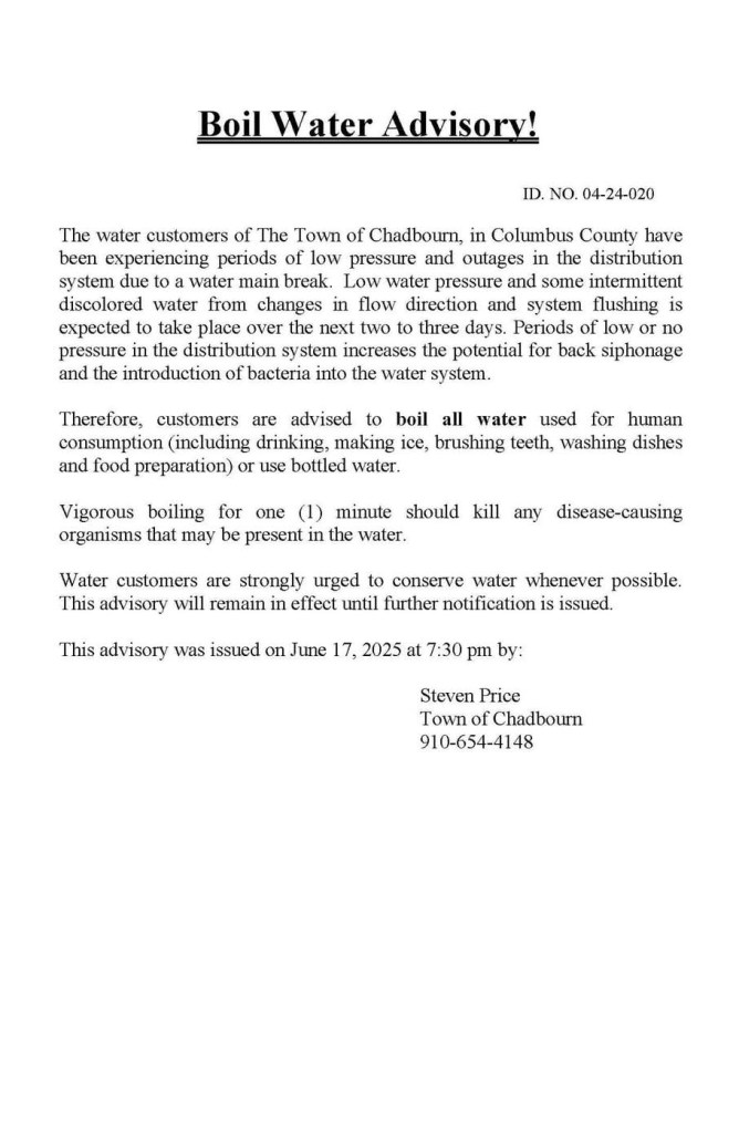 June 17, 2025June 19, 2025 Logan Kennedy Chadbourn Under Water Advisory ‘Until Further Notice’ The advisory has been lifted as of Thursday The Town of Chadbourn has released the following statement: Share this: Click to share on X (Opens in new window) X Click to share on Facebook (Opens in new window) Facebook Click to share on LinkedIn (Opens in new window) LinkedIn Click to share on Reddit (Opens in new window) Reddit Click to print (Opens in new window) Print